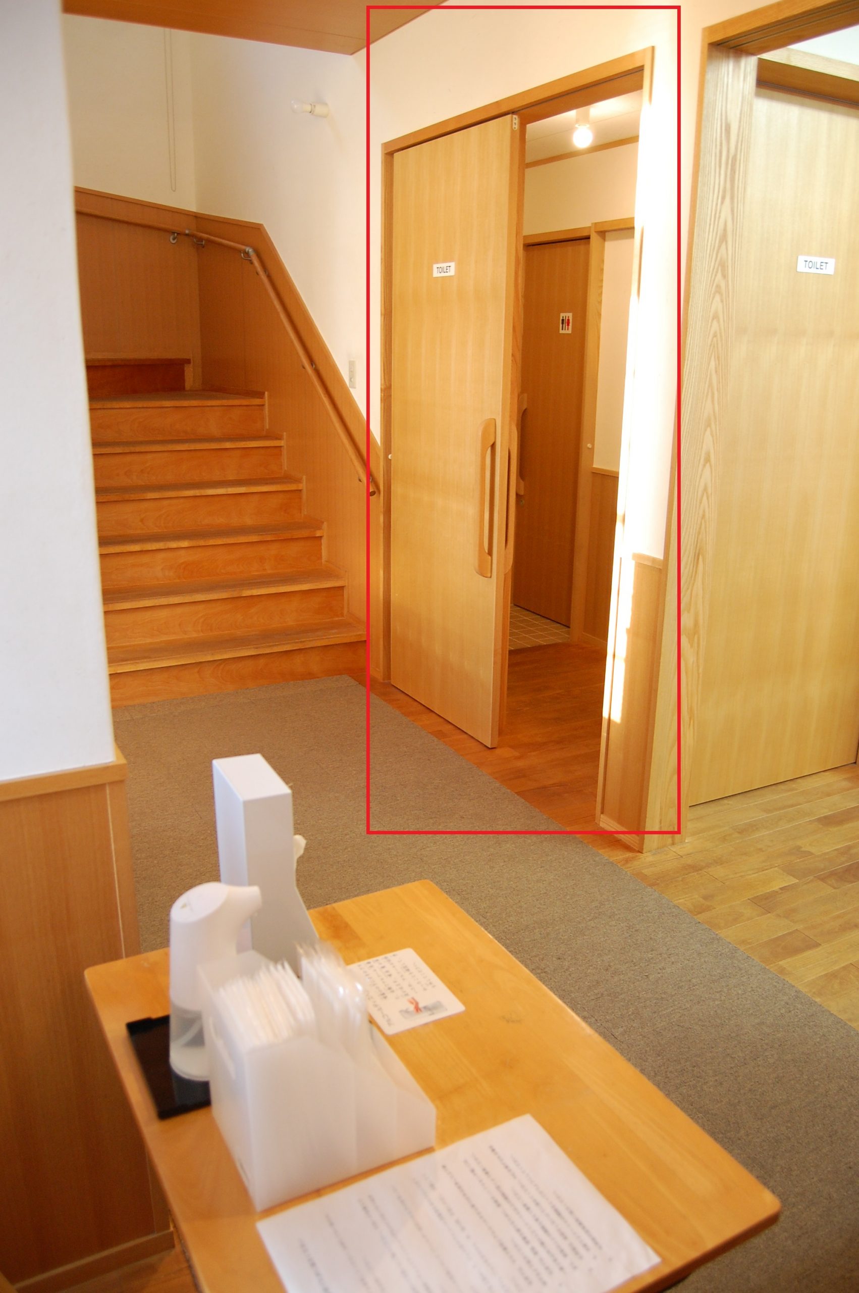 階段に向かって、右手奥の引き戸を開けると、女性用と男女共用のお手洗いが全部で4つあります。引き戸を開けた正面のお手洗いは、車いすの方もご利用いただけるお手洗いです。