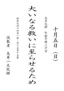 主日礼拝は最も大切な教会の集会で、毎週日曜日の朝、聖書の説き明しを中心とした礼拝を捧げています。日曜日を「主の日」としてキリスト教会が守っているのは、この日の朝に、わたしたちの罪のために死なれたキリストが復活された記念の日だからです。