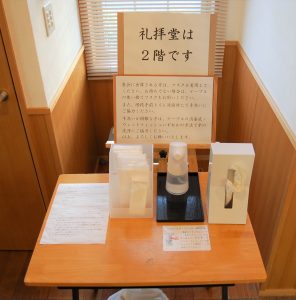 2階礼拝室には100名程度が着席できる長椅子がありますので、前後両隣のスペースを空けてご着席ください。1階集会室も椅子の間隔を空けて配置しています。換気のため、常時すべての窓を開けた上でエアコンを入れていますので、服装等の対応をよろしくお願いいたします。